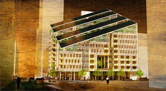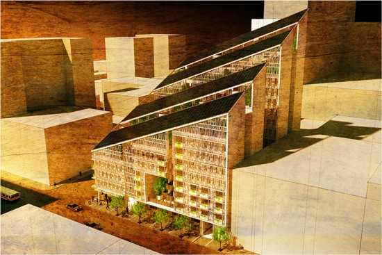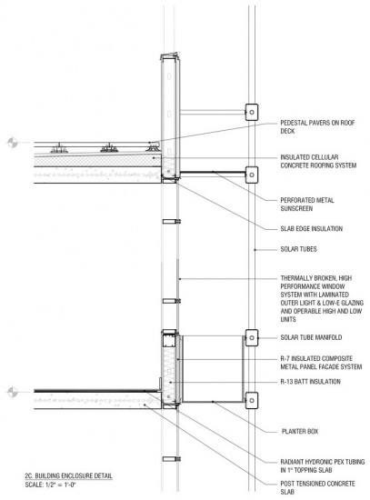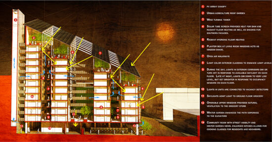 A high-density, residential-commercially zoned site located in the Tenderloin district of San Francisco sets the backdrop for the competition program of a 150-unit multi-family housing project. The goal was to get as close to zero net energy as possible, integrate renewable energy sources, and use waste heat generated from the mechanical systems for water or space heating. While addressing these design goals, the Folium solution anchors the corner of Eddy and Taylor Streets with a sculpted four-part building massing to optimize PV panel solar exposure and ventilation, and lacy and green facades formed by solar thermal tube panels.