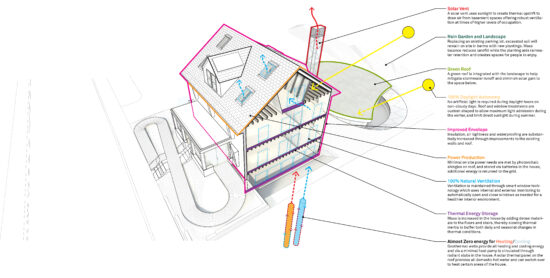 HouseZero consists of the original structure and an extension to the existing building in a subterrain called the vault. The current conventional heating and cooling systems in the house, including a gas-powered boiler, hot water heater, steam driven radiators, forced-air ventilation, and window-mounted air conditioning units will be fully replaced with the addition of thermal mass, including radiant surfaces, as well as natural ventilation inside both the existing house and the vault. Rather than approaching the project as a hermetically-controlled box, the envelope and materials of HouseZero are designed to interact with seasons and the exterior environment in a more natural way. Much like a layered approach to clothing, the house is meant to adjust seasonally.