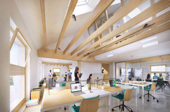 The zero-energy natural ventilation strategy is attuned to seasonal and climatic variables through adaptive installations, some passive and some with algorithm-based control technologies. Ventilation is controlled via WindowMaster’s actuated windows on all floors, while a passive solar chimney contributes to critical ventilation of the vault and the event space in the basement. Operable skylights are added to the roof plane to allow for a robust ventilation of the second and third floors as well as the stairwell. Furthermore, windows will let in air at select times to manage the indoor air quality during the winter. In the summer, the windows located at the higher-level will be utilized to keep the temperature in the building at the required level throughout the day. All openings are programmed for daily night purging to help stabilize indoor air quality throughout the seasons.
