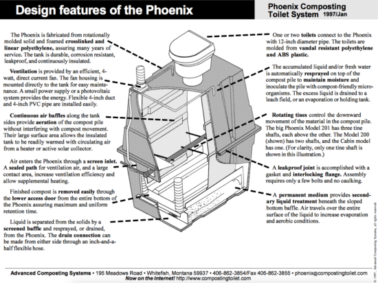 - Making on-site composting easy and eliminating water use: Advanced Composting Systems’ Phoenix Composting Toilet system supplemented with biochambers allow building owners to compost natural waste on-site rather than direct it to the municipal waste disposal or septic systems. The toilet requires no water for flushing, its 4-watt fan provides ventilation to ensure no odor, and its biochambers transform waste into mulch.