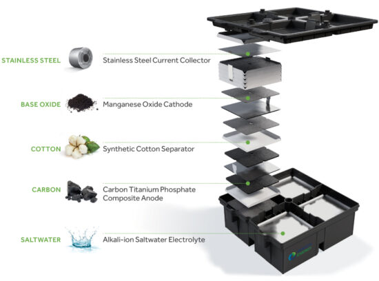 - Improving energy storage: Aquion Energy’s Aqueous Hybrid Ion “saltwater” battery that uses a non-hazardous sodium sulfate electrolyte instead of lithium salts (lithium ion) or sulfuric acid (lead-acid). Non-flammable and non-explosive, it is made from nontoxic materials and contains no heavy metals or toxic chemicals.