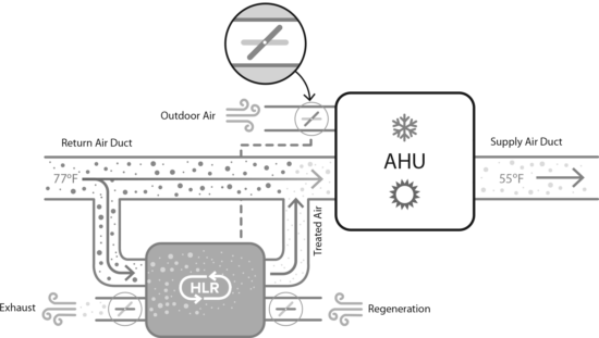 - Improving indoor air quality: enVerid’s HLR (HVAC Load Reduction) Ventilation modular system cleans indoor air rather than continuously venting conditioned indoor air and replacing it with outdoor air. It’s HLR module is a “smart scrubber” which removes CO2, VOCs, and other contaminants from indoor air with the aid of patented reusable sorbents. By cleansing the indoor air, the HLR module minimizes the amount of outdoor air required to maintain IAQ, thereby reducing the load on the HVAC system.