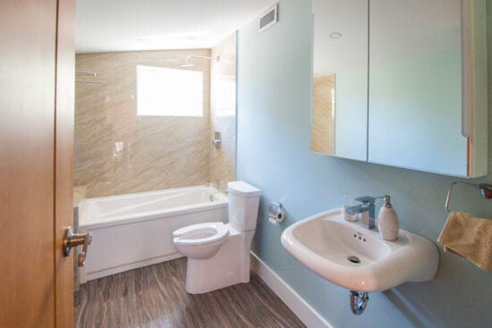 Moreover, this home uses a highly efficient heat recovery system with a heat pump. The heat recovery system extracts waste heat from exhaust air and water to increase the temperature of incoming air to the heat pump, resulting in an efficiency that is much greater than that of a typical heat pump system. The system allows fresh, healthy air to be brought into the house on a continuous basis at equal pressure as the outside air, which in turn eliminates heat loss and air leakage from the envelope.
