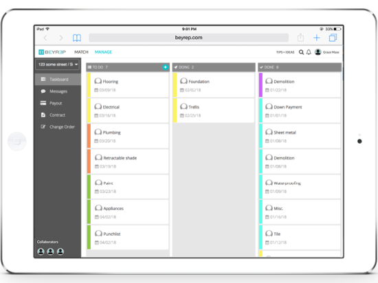 A Matchmaker + Wedding planner for home improvements, Beyrep provides everything a homeowner needs to confidently embark on a home improvement project and manage it to completion. And, it provides pros a smarter way to manage their projects and grow their business.