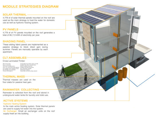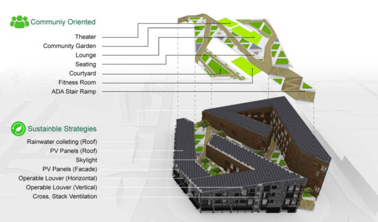The winning entry by Jon Lund and Luis Sabater Musa, the “3 Green Bars Building,” impressed the perFORM 2015 jury with its strong urban and environmental response, well considered proportions and design restraint, and emphasis on building energy performance as the path to Net Zero Energy building.